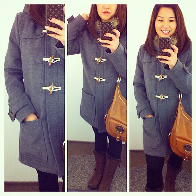 Old Navy Duffel Style Coat on sale for $38, Hunter Boots $130, Coach Bag $99, H&M Knitted Tube Scarf $12, H&M Sweater $56
